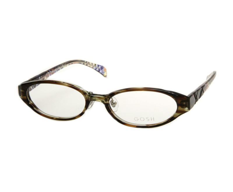 細身のオーバルタイプのアセテートフレーム。立体的なカッティングの入ったテンプルに鮮やかな色彩と格子模様が美しい、華やかだけど落ち着いた感じの「GOSH」です。